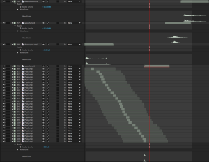 The Final step to the creation of this video was to add sound effects to all of the movements. For this project, most of the sounds were found online and many were modified to fit the motions of the animation. below you can see the layout of some the sound effects as they appeared in the After Effects timeline.